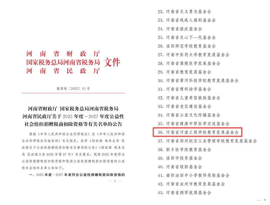 近日,省财政厅、省税务局、省民政厅联合发布《关于2025年度-2027年度公益性社会组织捐赠税前扣除资格等有关名单的公告》(豫财税〔2025〕15号)。我校教育发展基金会荣列榜单,正式获得2025年度至2027年度公益性捐赠税前扣除资格。这标志着基金会的规范运作和公益属性获得了权威部门的认可,为学校广泛吸纳社会资源、助力事业发展开启了更广阔的通道。